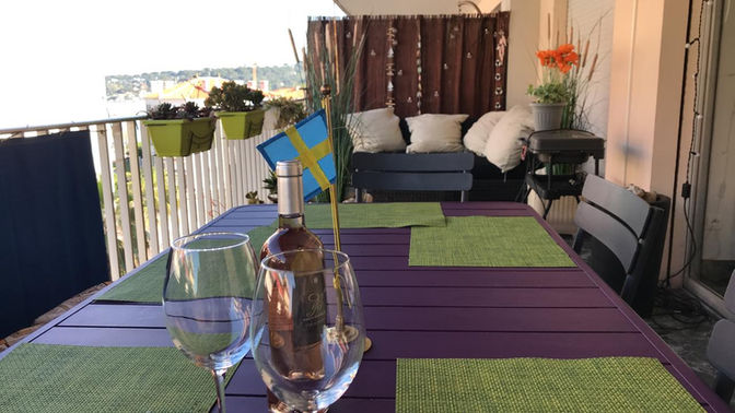 Stor balkong/terass, på 20 kvm, med havsglimt.